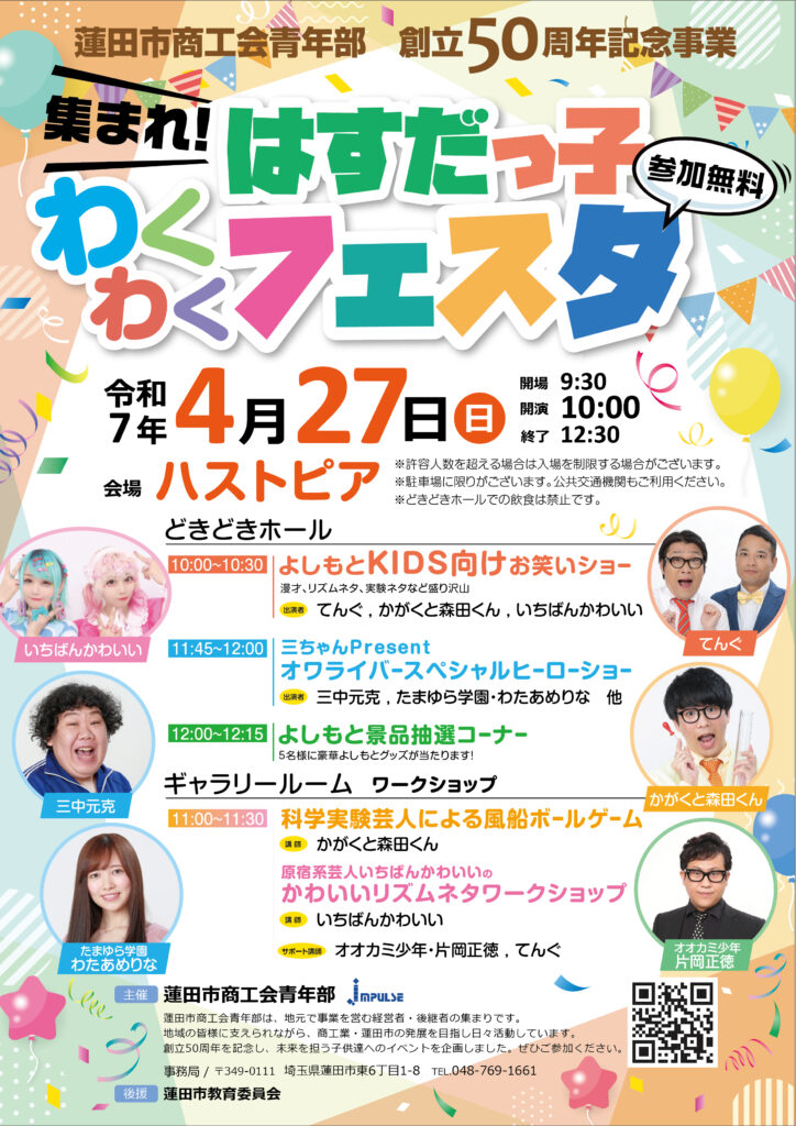 2025年4月27日(日)に、蓮田市商工会青年部創立50周年記念事業、はすだっこわくわくフェスタを開催致します。